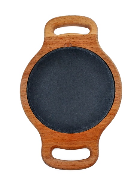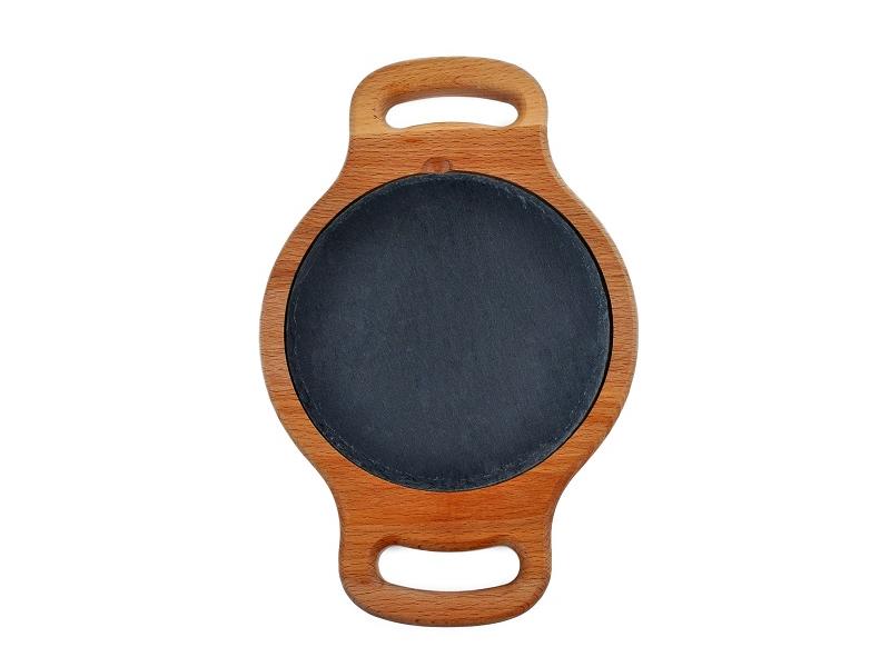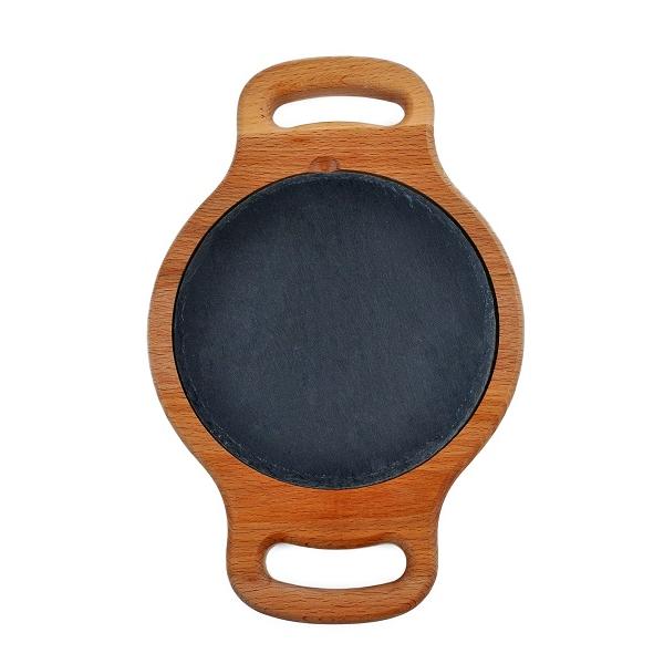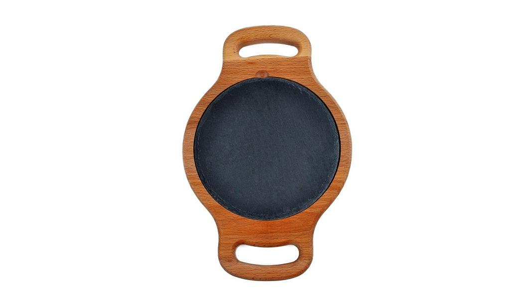 Блюдо для подачи круглое d=15 см. h=1,5 см. черное, сланец, на дерев. подставке с ручками /1/ АКЦИЯ