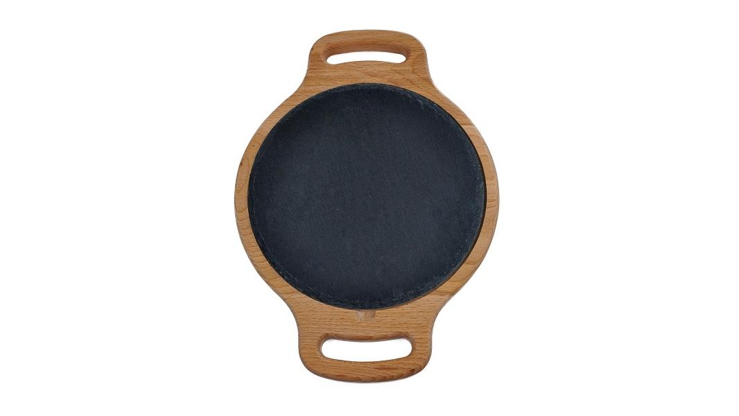 Блюдо для подачи круглое d=20 см. h=1,5 см. черное, сланец, на дерев. подставке с ручками /1/ АКЦИЯ