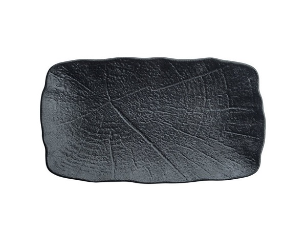Блюдо для подачи насыщенного черного цвета со стилизацией поверхности под рисунок листьев лотоса.