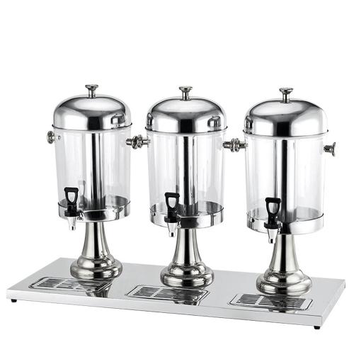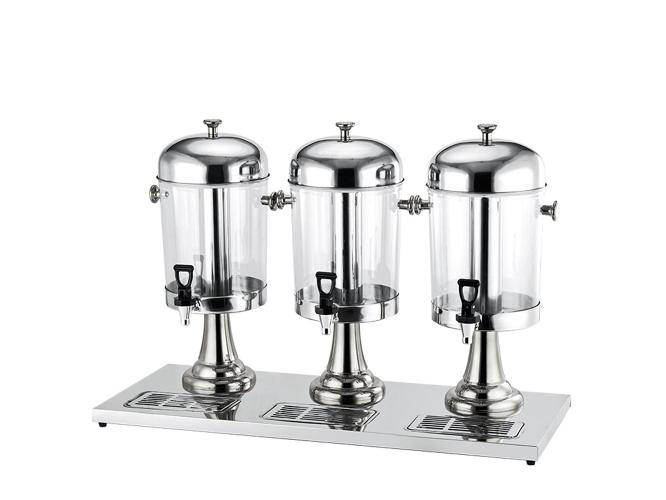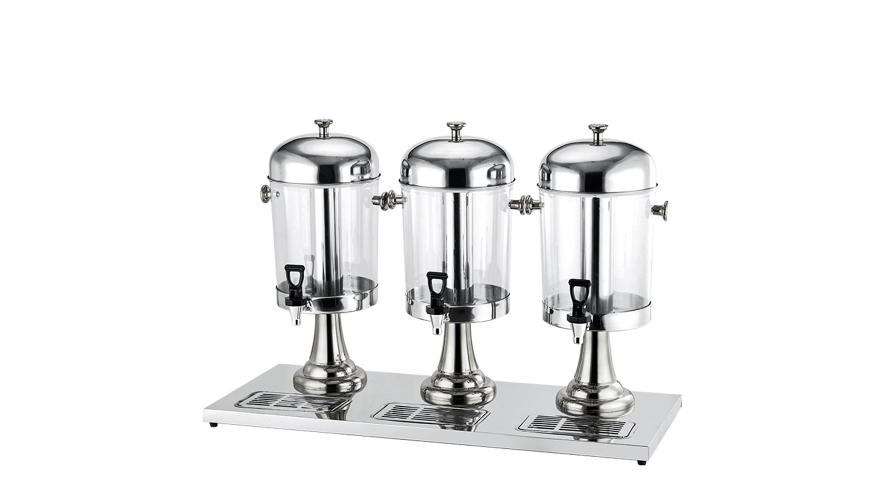 Диспенсер для соков и холодных напитков с тремя емкостями по 8 л каждая. Высота 56 см, общая длина 85 см. Колбы из пищевого полиэтилена, основание, крышки, поддон и контейнер для льда из нержавеющей стали. Оснащен качественными кранами с уплотнителями и поддонами для сбора капель. Идеальное решение для кафе, ресторанов и мероприятий — удобно, гигиенично и стильно.