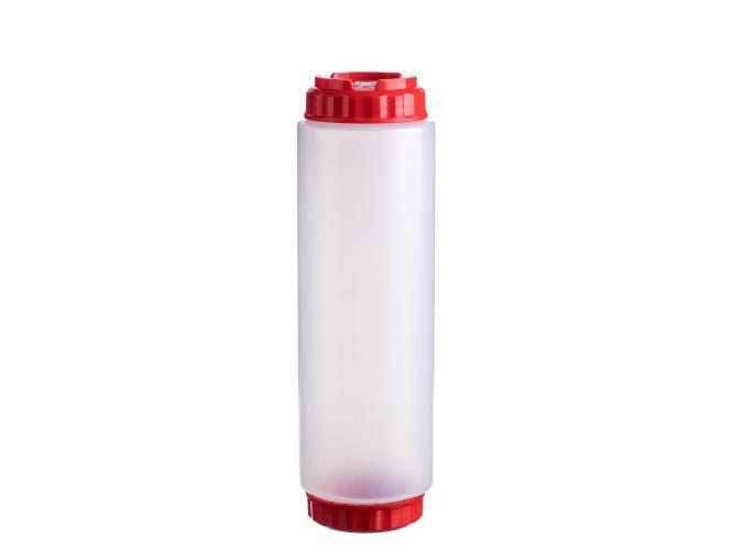 Емкость для соуса 1000 мл. d=75 мм. h=257 мм. c 2 крышками, с силик. носик. широкая прозрачная, крышки красные GP /1/96/