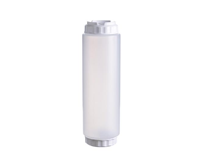 string(968) "Емкость для соуса 1000 мл выполнена из прочного пищевого пластика и предназначена для профессионального использования в сегменте HoReCa. Конструкция имеет две откручивающиеся крышки и съемный силиконовый клапан, что обеспечивает удобство наполнения, использования и ухода, а также позволяет дозировать содержимое без подтеков и экономит место для хранения. Белый цвет служит маркировкой для майонеза и других белых соусов. Прозрачный корпус облегчает визуальный контроль содержимого. Подходит для мытья в посудомоечной машине.