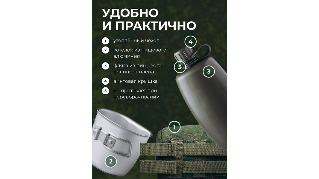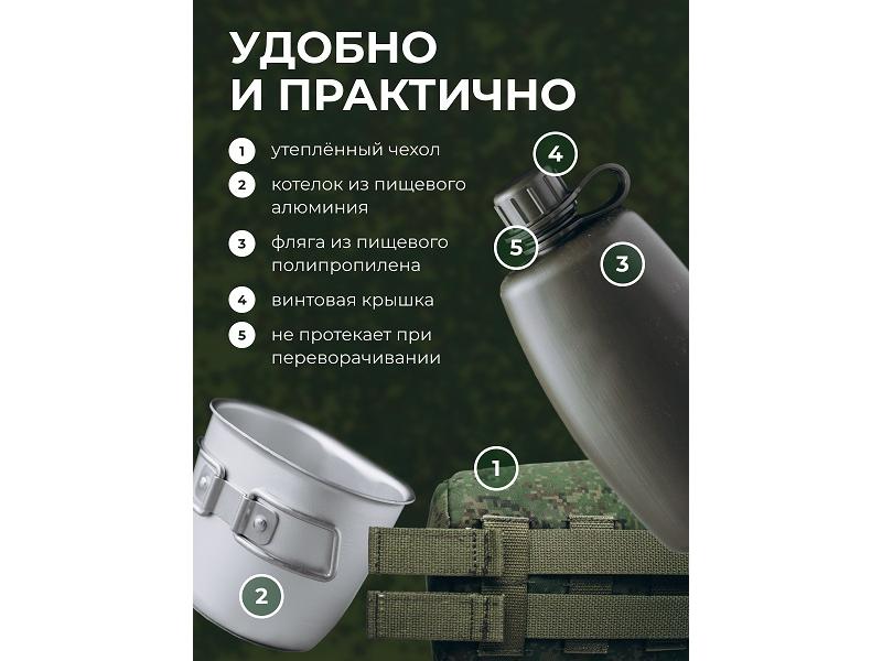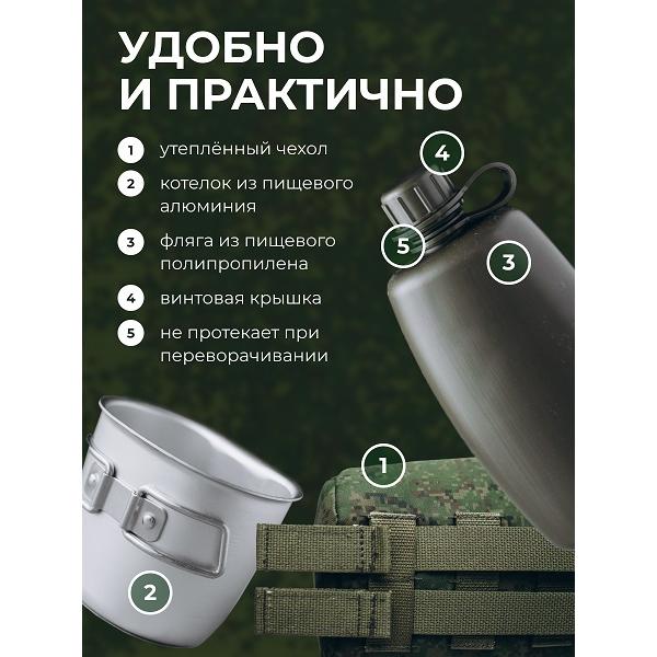 101,3*64,9*213 (фляга 750мл) 109,5*75,4*83,1 (котелок 350мл), вес 170гр, с чехлом 273гр. Фляга предназначена для содержания питьевой воды, котелок для приготовления кипятка. Материал: фляга полиэтилен, котелок: пищевой алюминий.