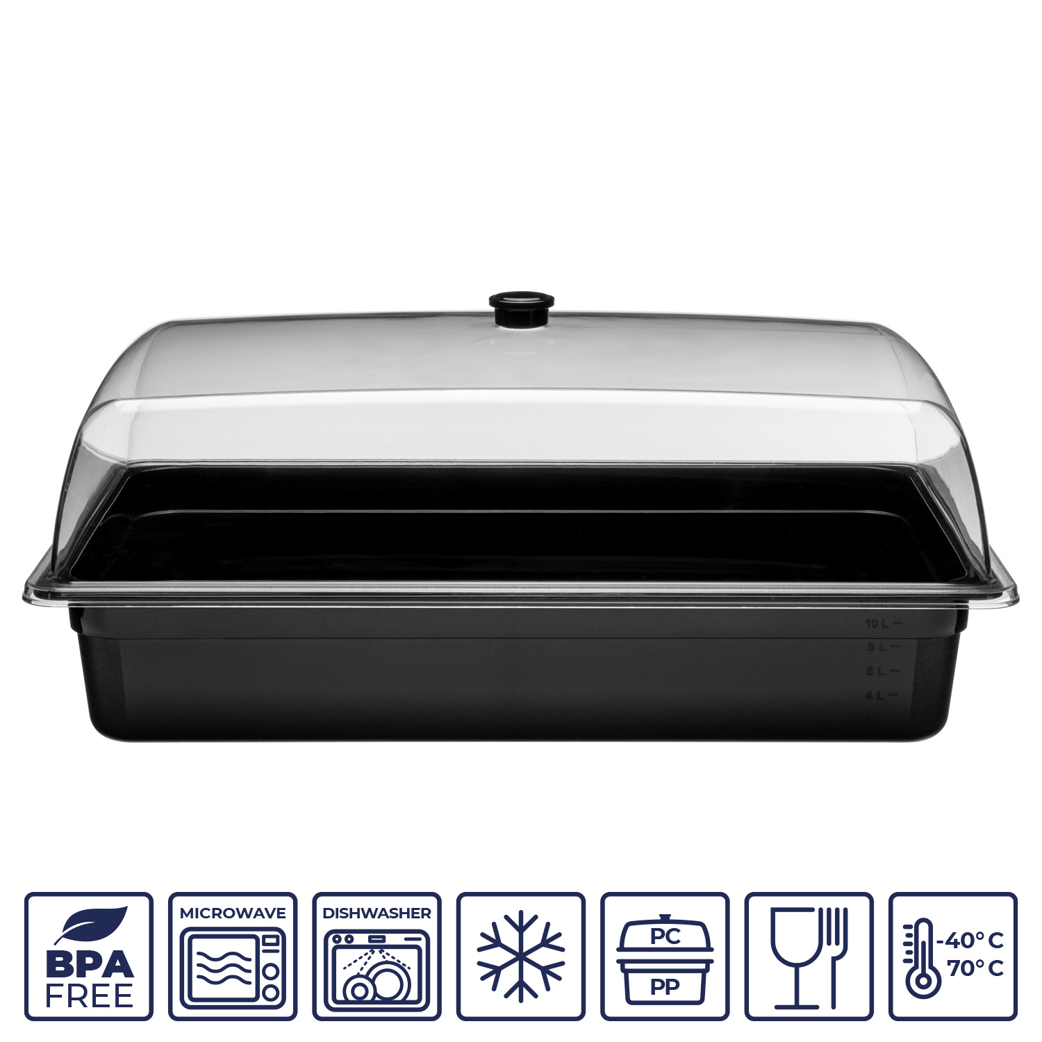 •Гастроемкость изготовлена из безопасного для здоровья полипропилена (PP), который не содержит BPA (бисфенол А). Это гарантирует, что вкус и запах пищи не будут искажены, а также обеспечивает сохранность и безопасность продукта.