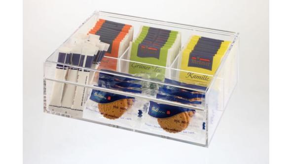 3 отсека для чайных пакетиков, 1 отсек для сахара, печенья.