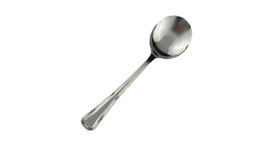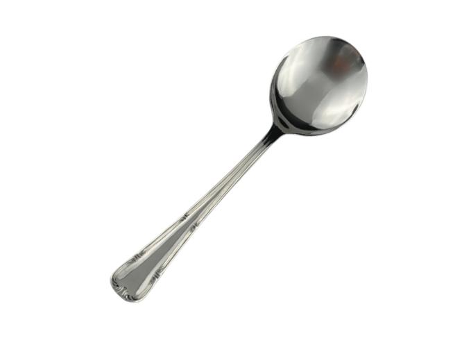 Ложка для бульона Abert Henry VIII – профессиональный столовый прибор, оформленный в классическом стиле с элегантным узором, проходящим по кромке ручки.