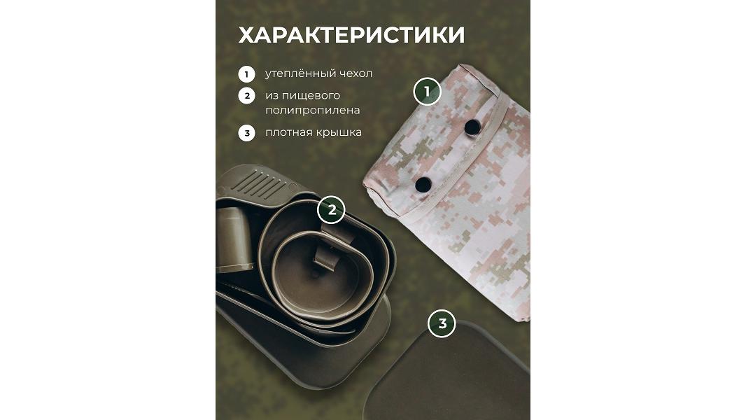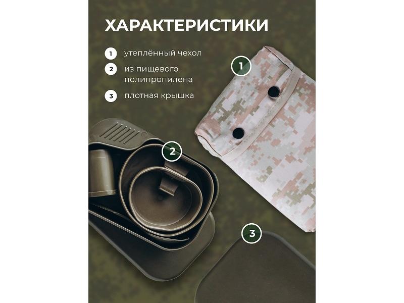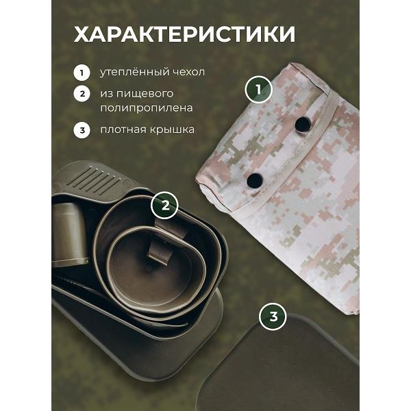 Вес с чехлом 490гр. Пластиковый комплект состоит из: Контейнер (предназначен для хранения в походном положении тарелки, чашки, прибора для специй и столового прибора. Крышка контейнера служит подносом для тарелки и чашки, корпус контейнера предназначен для второго блюда). Тарелка складная 700мл, чашка складная 300мл, прибор для специй трехсекционный, столовый прибор 3 в 1. Материал: контейнер, прибор для специй - полипролилен. Чашка, Тарелка - термоэластопласт, Столовый прибор - АБС пластик.
