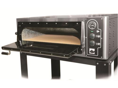 Камера вмещает 4 заготовки для пиццы диаметром 350 мм. Рабочий диапазон температуры духовки 20-4500 С. Печь имеет возможность устанавливаться на подставку ПП-4. Облицовка выполнена из крашенного металла, дверка и рамка камеры из эмалированного, а жарочный шкаф из оцинкованного листа толщиной 1,5 мм. В камере установлены поды из жаропрочного камня толщиной 15 мм. Печь для пиццы работает от сети 230 В.