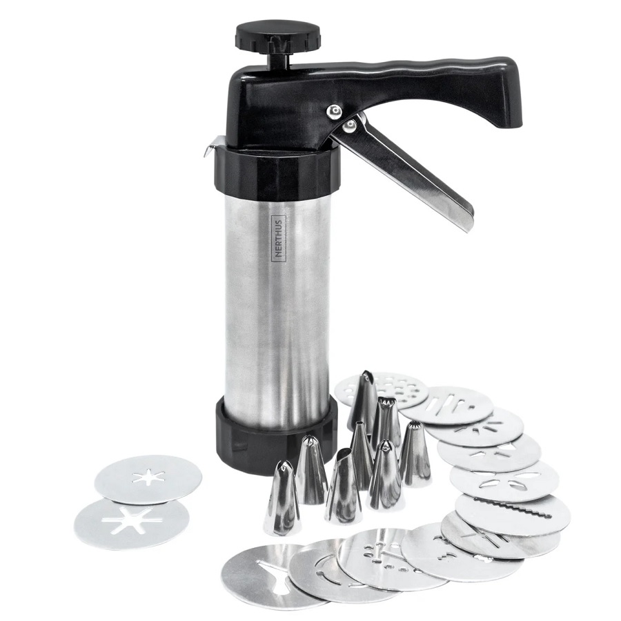 Шприц кондитерский с комплектом из 8 насадок (нерж.) и 13 формирующих дисков (алюм.). Предназначен для порционной подачи теста, крема, муссов.