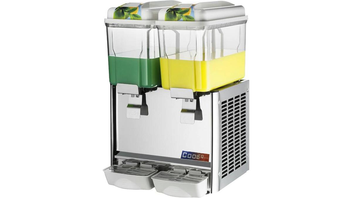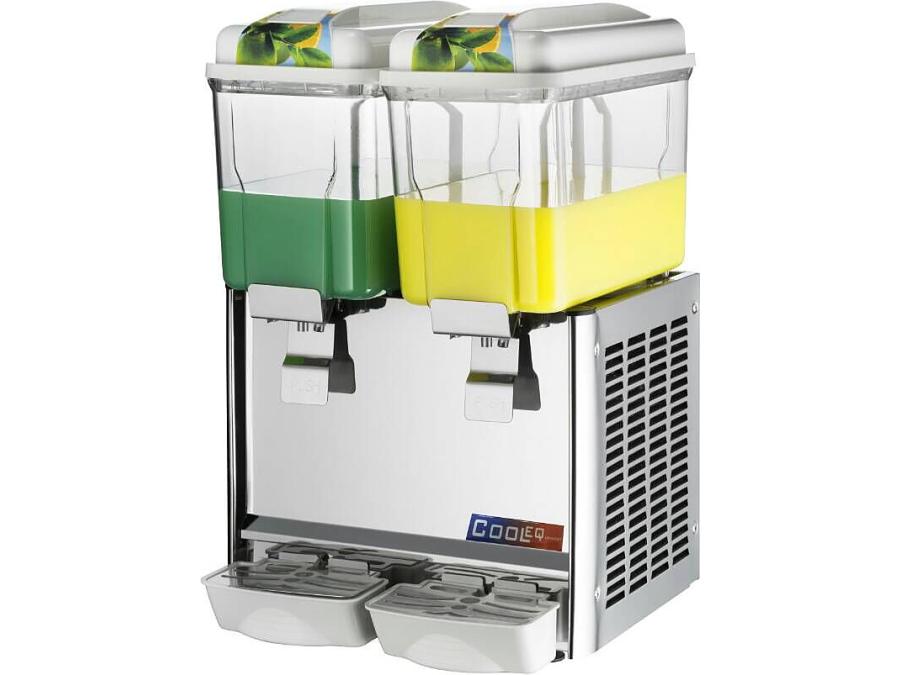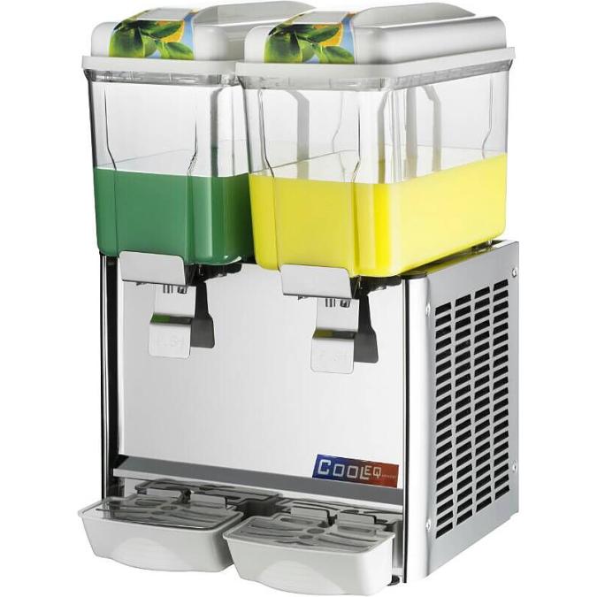 Сокоохладитель Cooleq JD-12+12 предназначен для хранения в охлажденном состоянии и последующей раздачи чая, соков, кофе и прохладительных напитков на предприятиях общественного питания и торговли. Модель оснащена лопастной системой перемешивания, которая гарантирует однородность консистенции и температуры продукта, а кран - бесперебойную подачу содержимого сокоохладителя. Корпус выполнен из нержавеющей стали, бункер - из прочного поликарбоната.