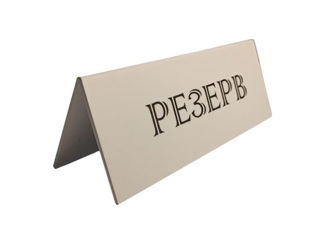 Табличка Резерв белая двусторонняя с английским эквивалентом русского слова. Размер двусторонней таблички 210х80 мм. Универсальна в применении для заведений общепита. Безопасная, ударопрочная табличка которая прослужит долго.