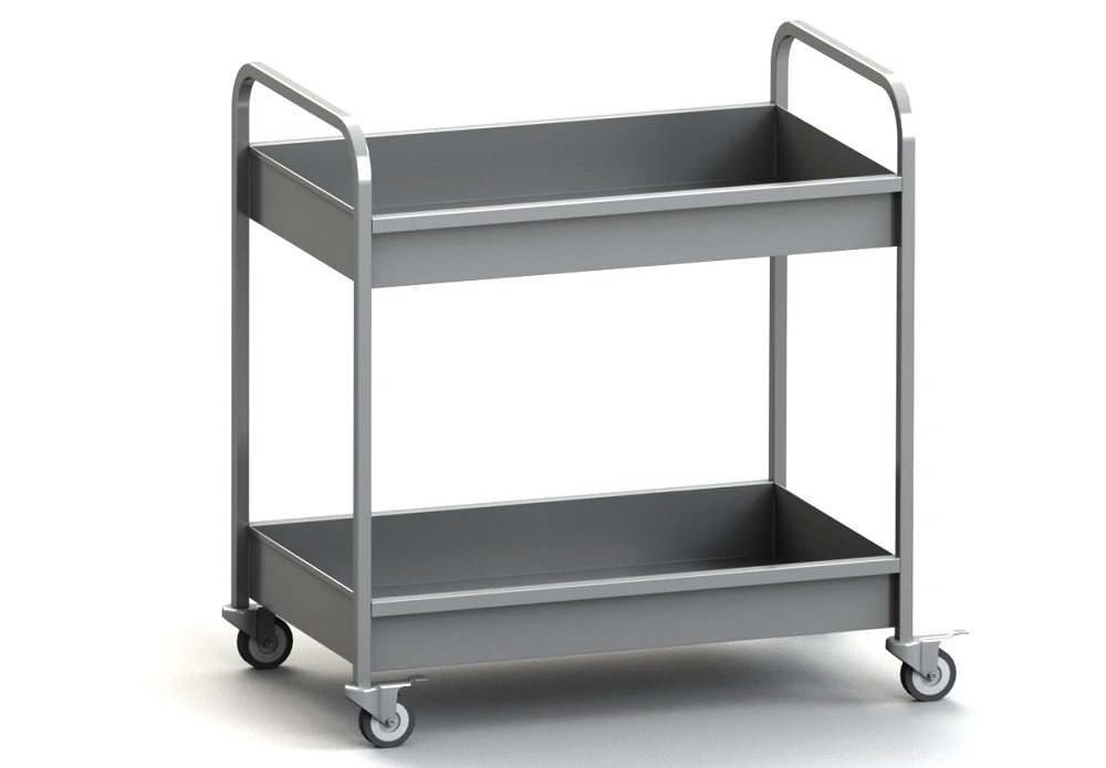Тележка имеет 2 полки глубиной 100 мм. и 4 поворотных колеса с тормозом.