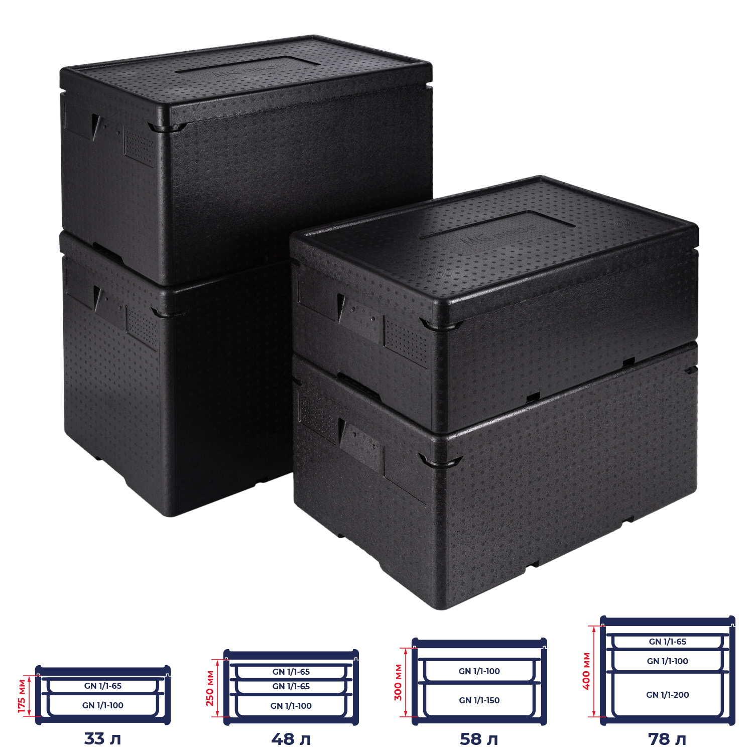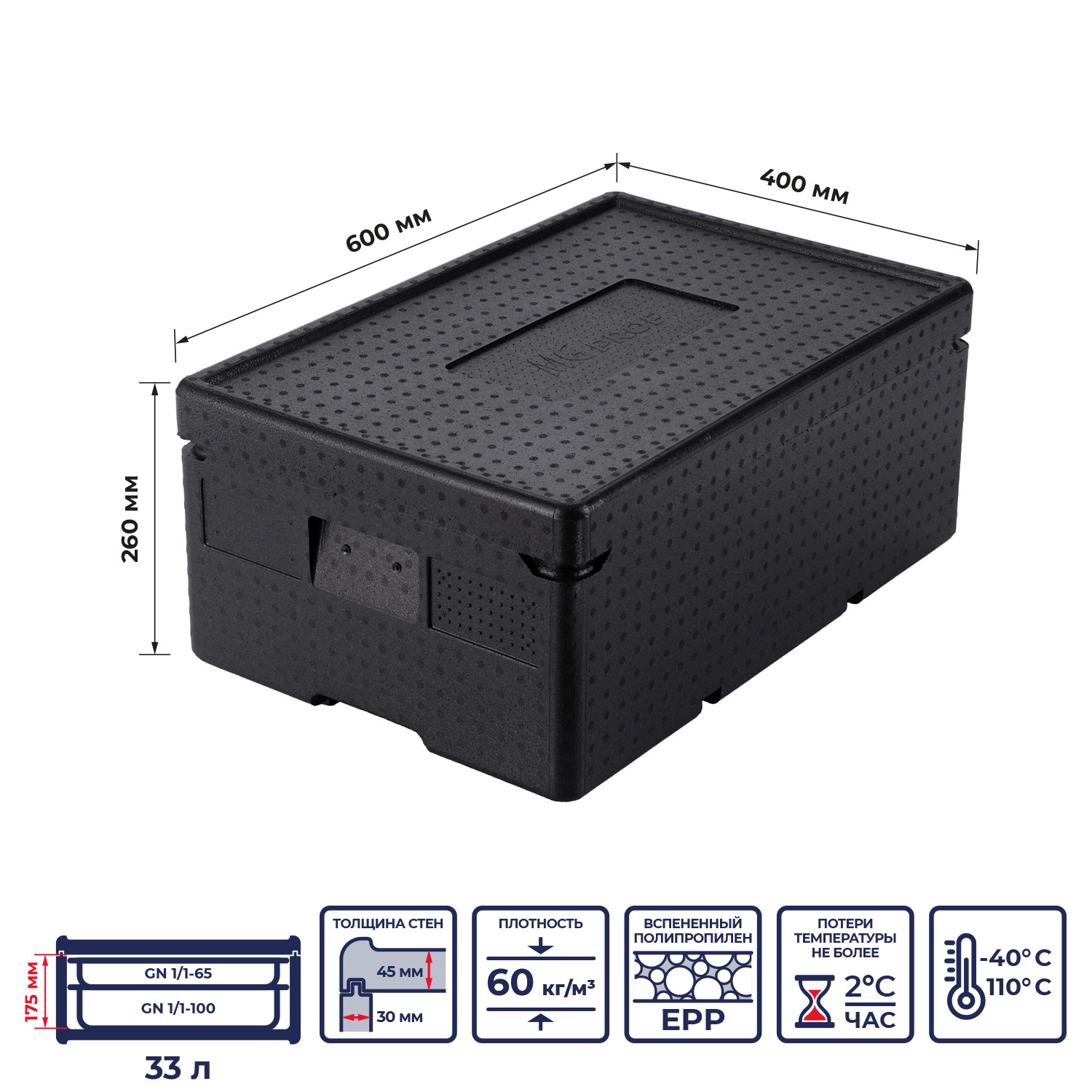 Термоконтейнер 33 л. 600*400*260 мм. для гастроем. h=150 мм. (-40°C до +110°C), плотность 60кг/м3, п/п MGprof /1/2/